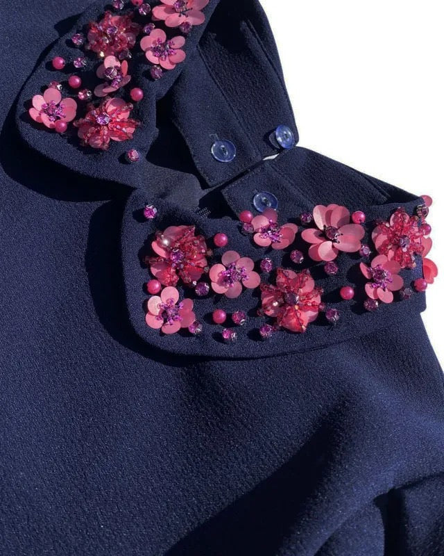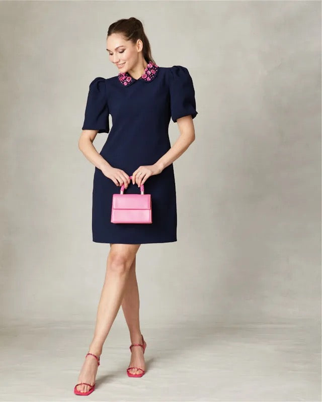 The Sabrina Dress features a meticulously hand-beaded detachable collar, allowing versatile styling for any occasion. Designed with elegant puff sleeves and practical pockets, this dress effortlessly blends refined detail with modern functionality.