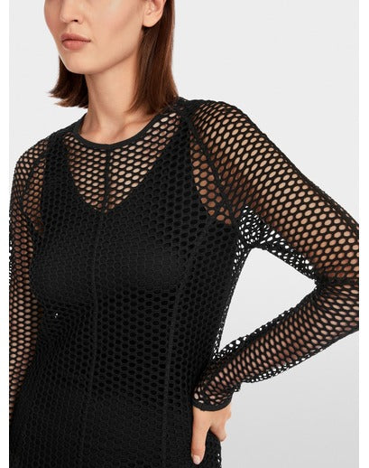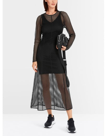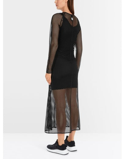 Long dress in stretchy mesh. This garment has a body-hugging shape styled with Viennese seams. The neckline and hems are trimmed with piping. The mesh is semi-transparent and the dress can be worn with an opaque slip dress (underdress). A style statement for parties and events.