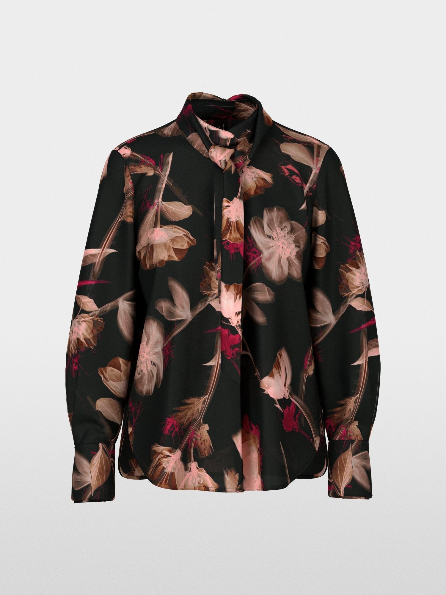 Elegant silk blouse with detachable bow and feminine floral print. With its loose fit, deep V-neck and subtle sleeve slits, it has an airy lightness and sophisticated look.