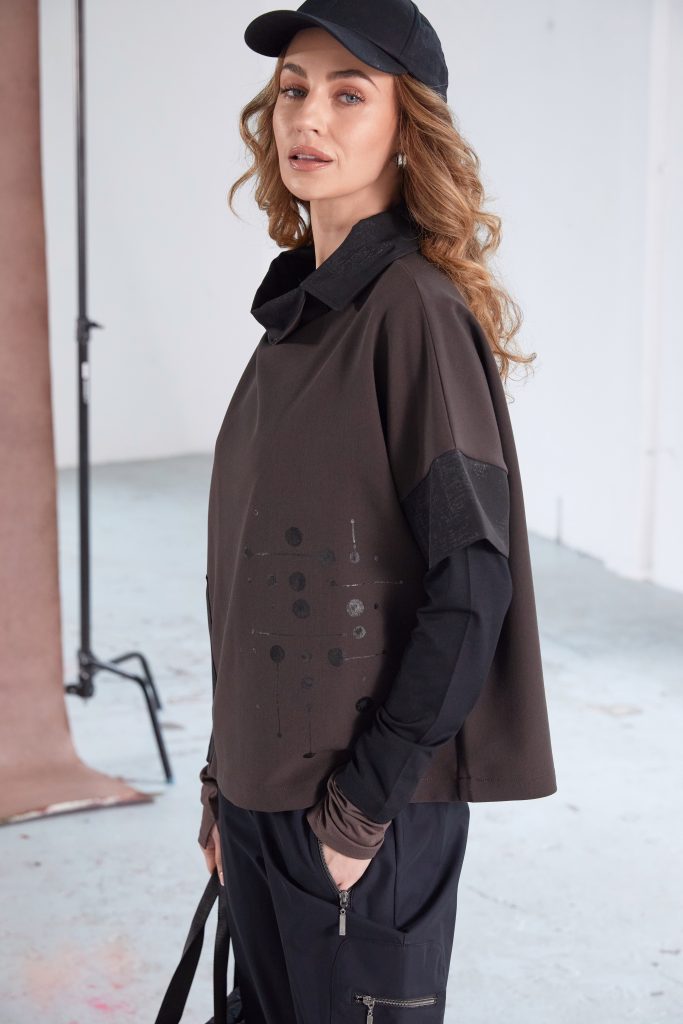 BETTER BALANCE; The NAYA placement print top is beautifully balanced for autumn / winter. Thanks to the contrast trim placed thoughtfully to the cutaway collar, cuffs, and side panel. Last but not least to complete the look a small scattering of print is placed to one side of the bodice.