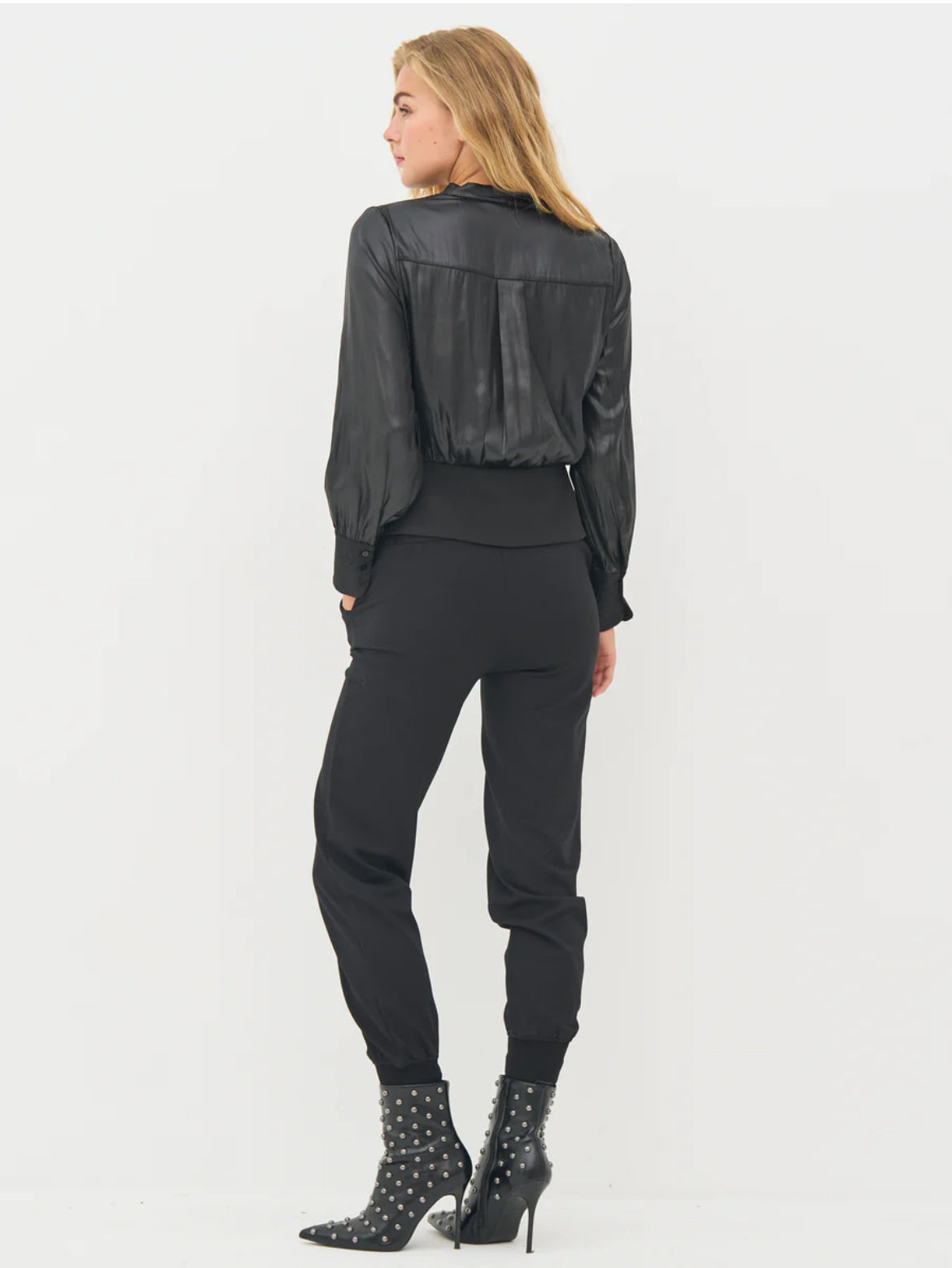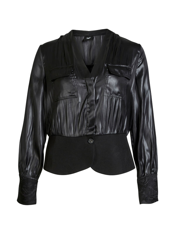 This shirt combines elegance and modern design with its shiny material and soft draping. It features a deep V-neckline, two chest pockets with flaps, and a defined waist with a wide waistband and button closure. The sleeves end with cuffs that have embroidered texture, adding a refined touch.