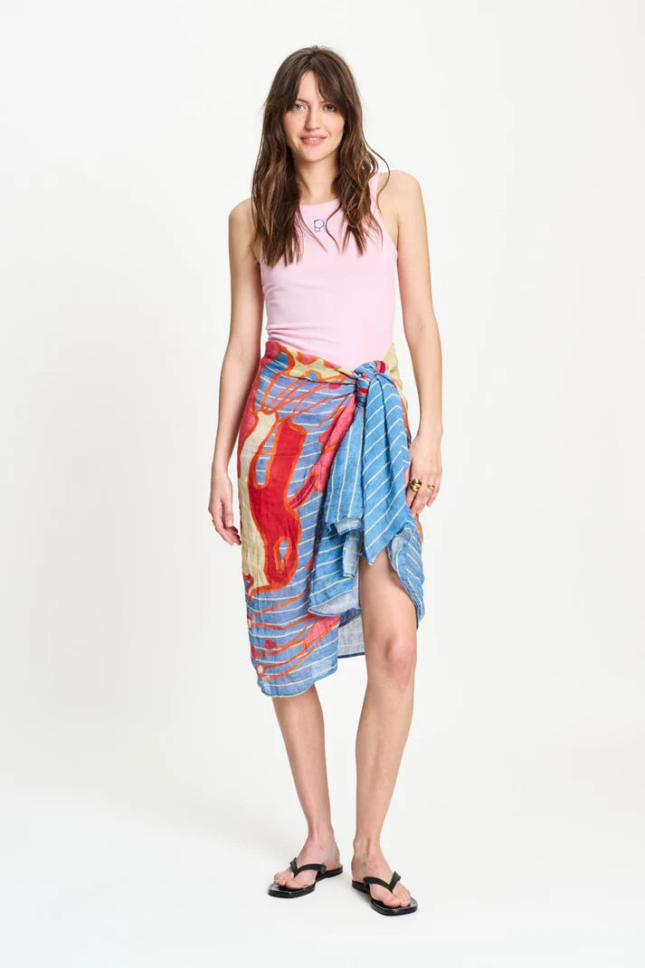 This blue and white striped linen scarf with a pink floral print feels fresh and airy. Made from lightweight linen, perfect for warm days.